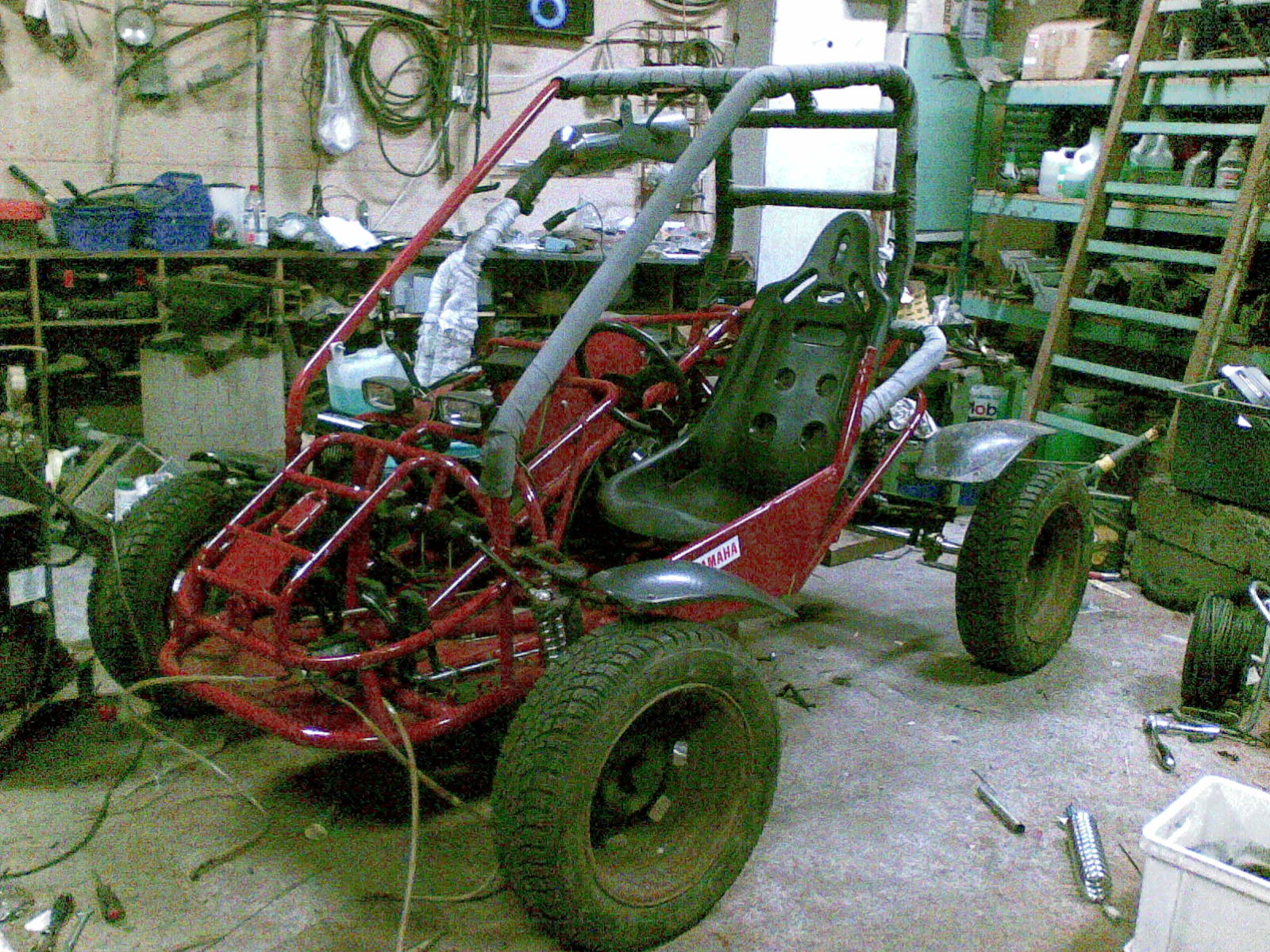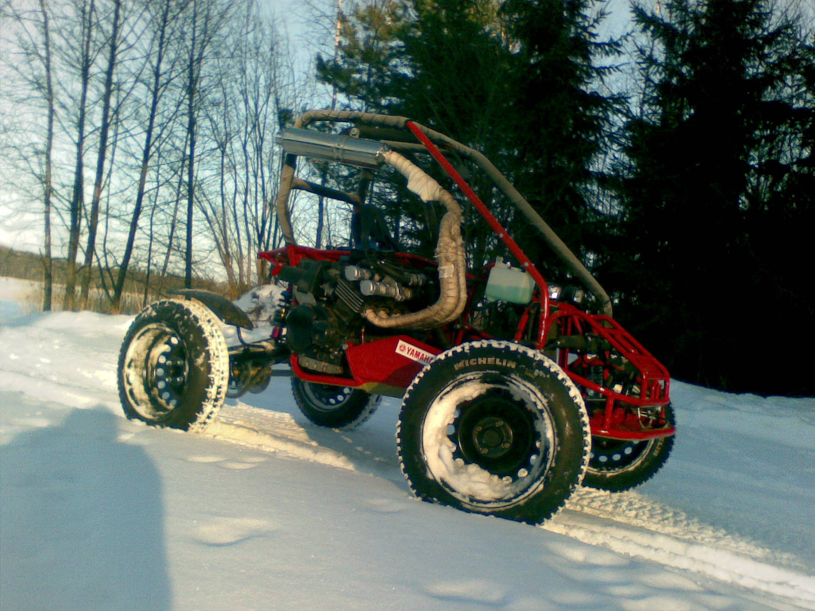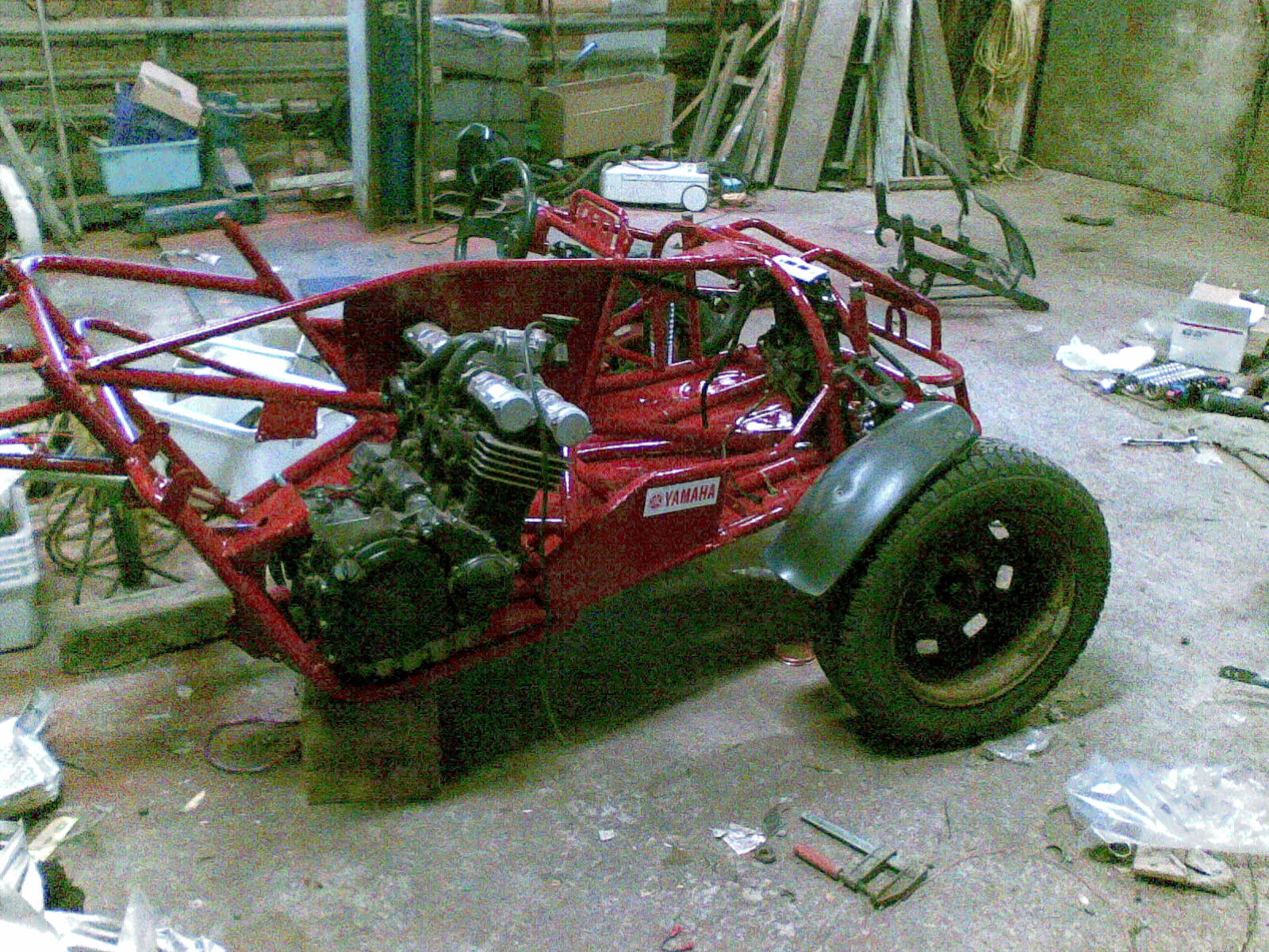 Alkuperäinen moottori oli noin 10-heppainen variaattorivetoinen kapine, joka lepäsi vähän erikoisesti puoliksi taka-akselin päällä. Sen tilalle löytyi nettivaraosasta kolaripyörästä otettu vm 2000 Yamaha Fazer FZS600 moottori, jotain 100hp siinä kai lienee voimaa.