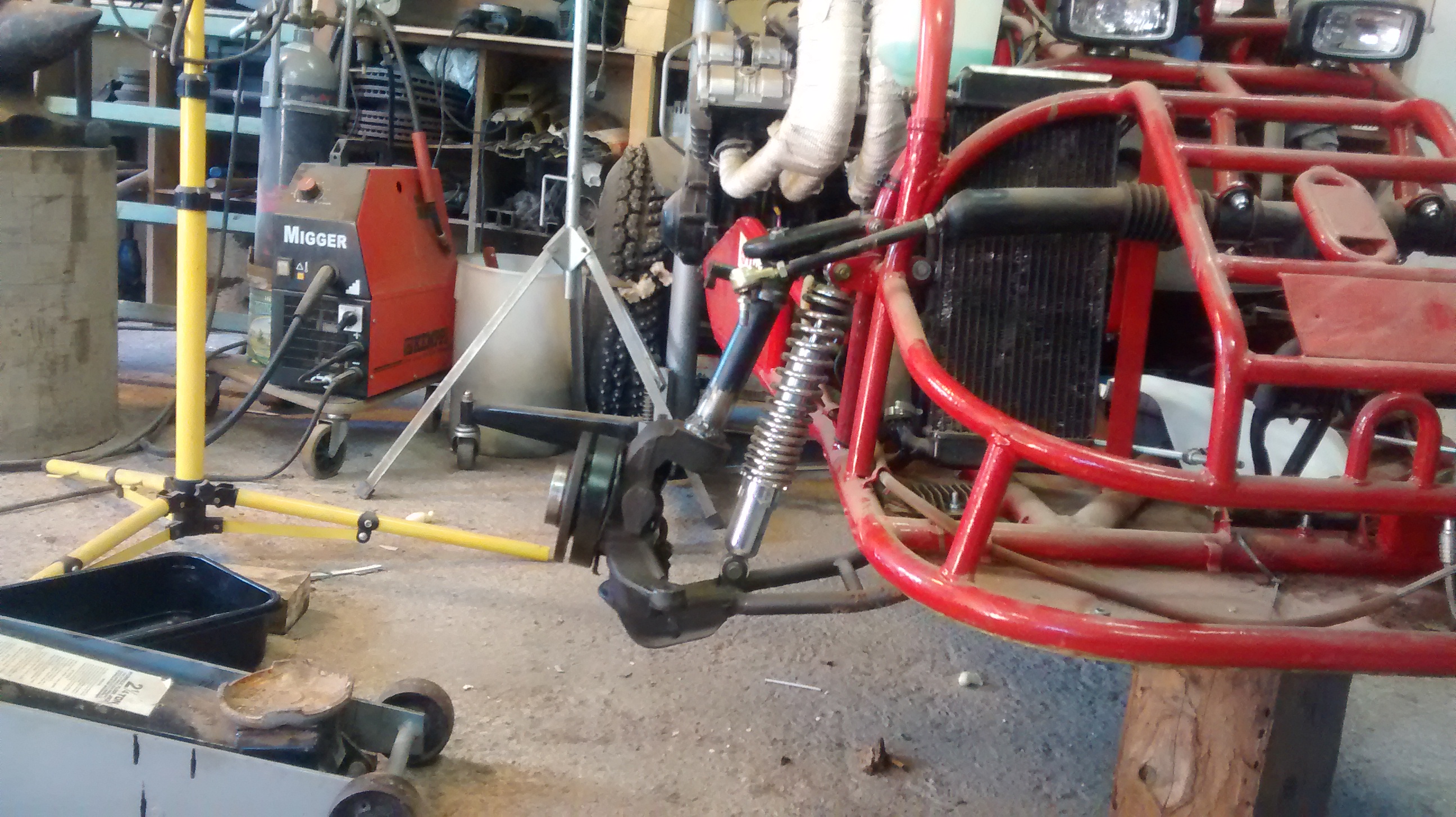 Ja sehän toimii! Etupään ripustukset toimivat hyvin, pyörät kääntyy linkkuun ja oikenee helposti leveästäkin sladista. Eli miehekäs camber saa olla. :)