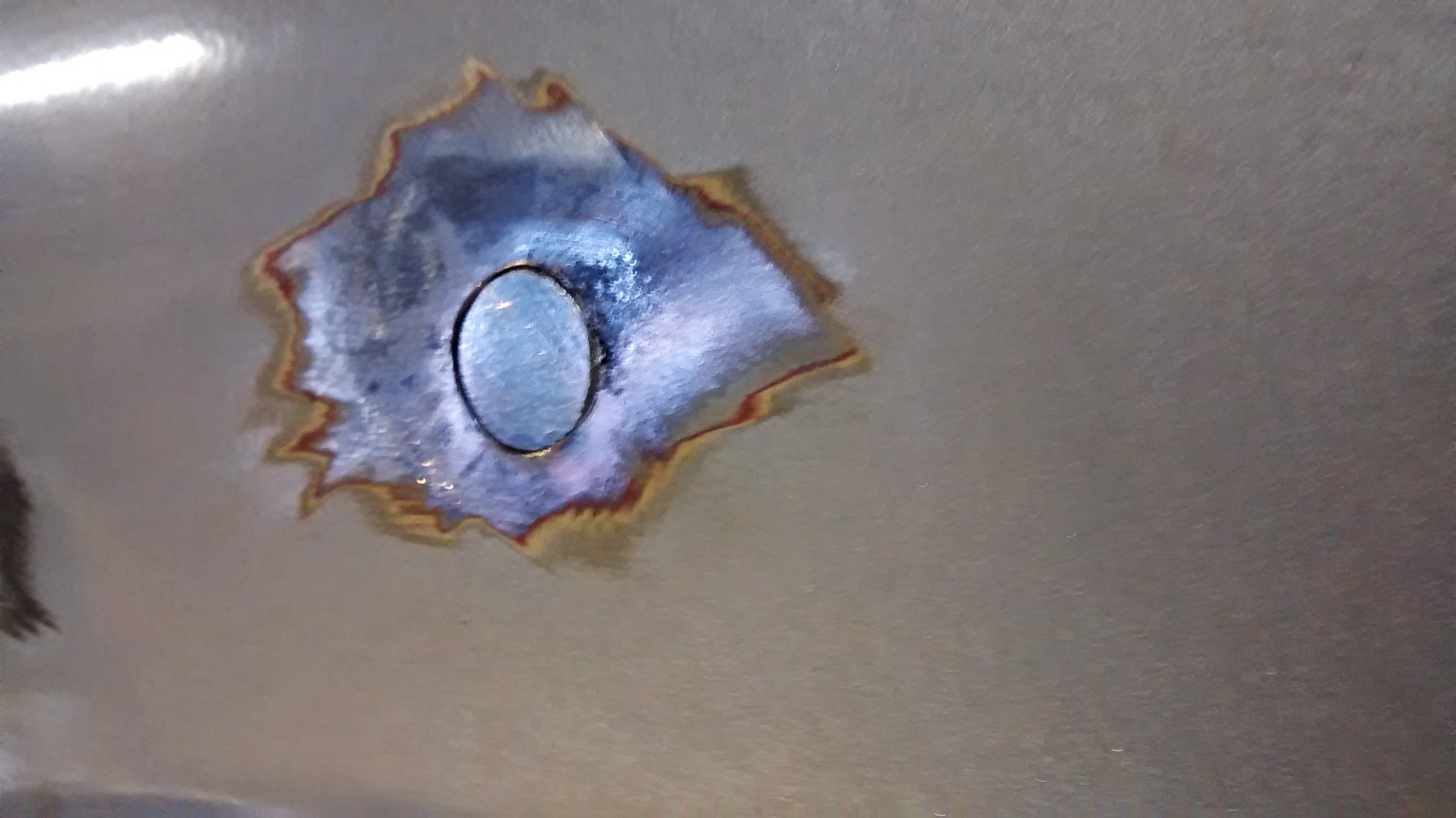 Etunurkat olivat muuten aika hyvässä kunnossa, mutta oikeassa lokarissa oli pari pientä kukkaa jotka tarkemmin tutkiessa ropsahtivat läpi asti reiäksi. Porasin joulukuusiterällä reikiä sen verran isommaksi että joka puolella oli ehjää peltiä. Sitten piti jostain saada pyöreitä lätkiä mitkä sopivat täsmällisesti reikiin.. No niitähän syntyy kun tehdään. :)