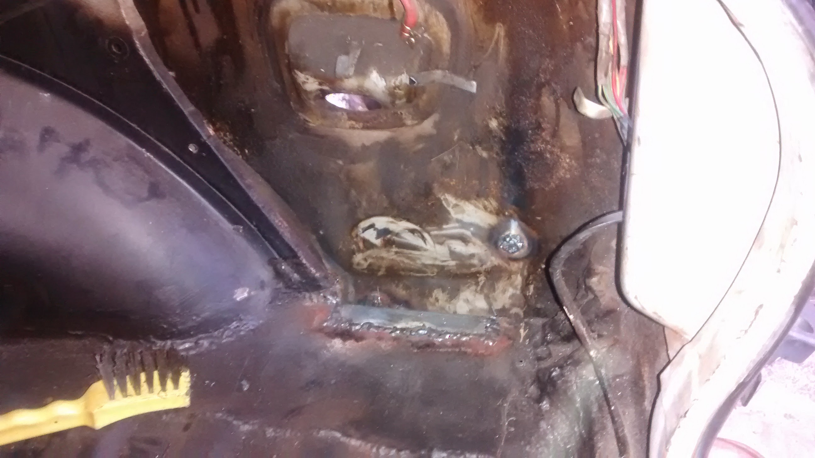 Autoa ostaessa pikaisesti naputtelin lokarin kaaret läpi, ja ihan kovalta ne tuntui vaikka ilmiselvältä näyttikin että on kittailtu jonkin verran. Akkuja takakonttiin sovitellessa perä lysähti sen verran syvään, että pyörät ottivat kaariin kiinni, ja sieltähän alkoi kittailut ropisemaan saman tien. Vähän kun vasaralla napautti lisukkeeksi niin oikea takanurkka näytti tältä: