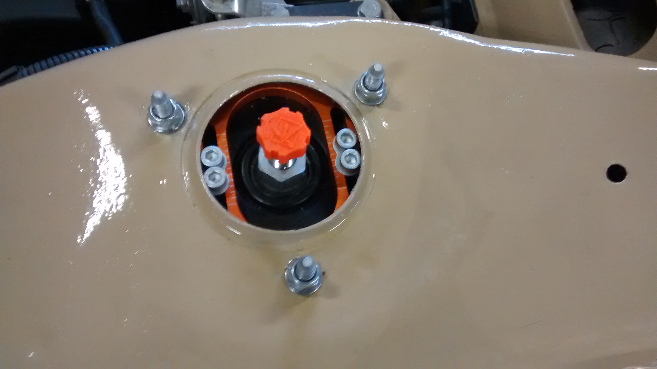 Kuten sanottua, yläkiinnikkeen pulttijako kävi suoraan. Camber-säätö on vähän tiukahko mutta toimii kyllä ihan hyvin, sillä iskarin ylälautasessa on ruuveille useita reikiä.
