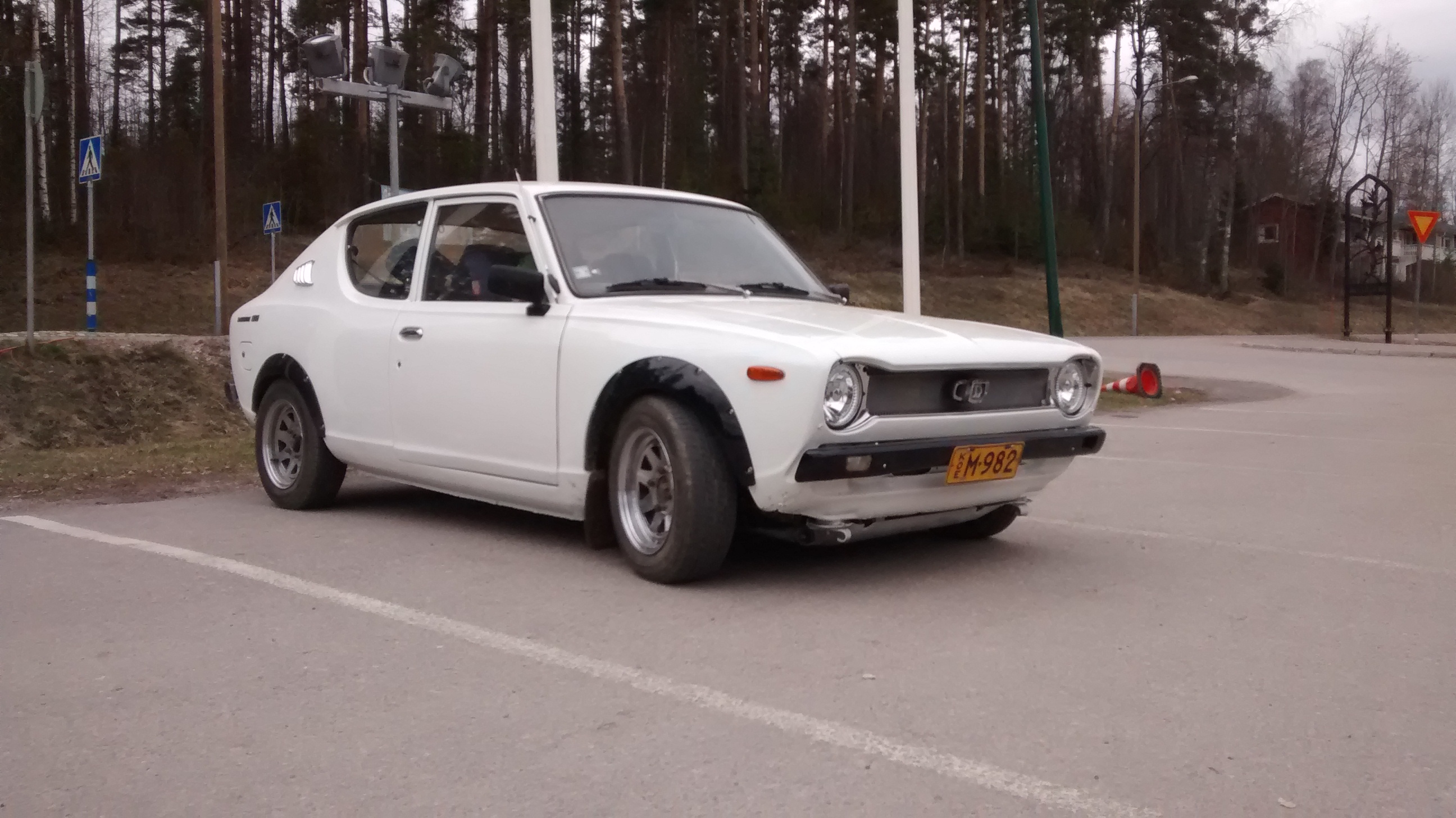 Datsun on vakionakin aika hupaisasti “keulivan” näköinen, ja tilanne tuntui pahentuvan vaan kun akkujen myötä auton painopiste siirtyi jonkun verran taaksepäin. Tuon itse maahan K-Sport coilover-alustasarjoja. K-Sportilla ei ole 100A:han valmista sarjaa listoilla, mutta minulla oli hyllyssä kaikenlaisia ylijäämäosia mitä sovittelin paikoilleen.