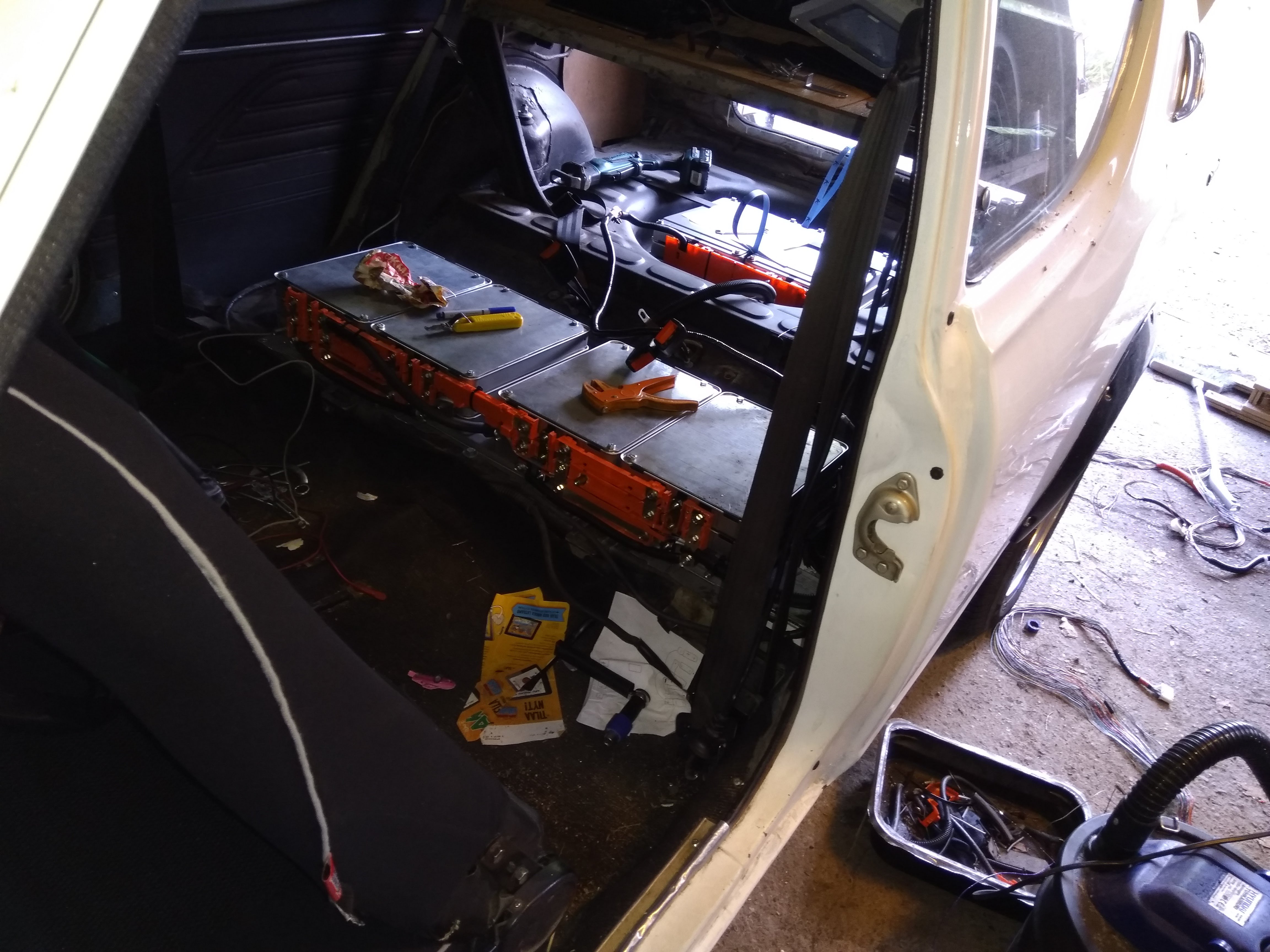 Takapenkin tellinki paikallaan, ja ensimmäiset akut nipussa. Tein 3mm teräslevystä “stressilevyt” tuohon akkupinon päälle. Alkuperäisetkin kiinnikkeet on semmoiset että akut on tosi tiukasti pinnapulteilla nipussa, paksujen teräslevyjen välissä. Litium-akut pyrkivät pullistumaan hiukan ladatessa, ja jos tuota muodonmuutosta ei pidetä kurissa se tuhoaa akun rakenteen pikkuhiljaa.