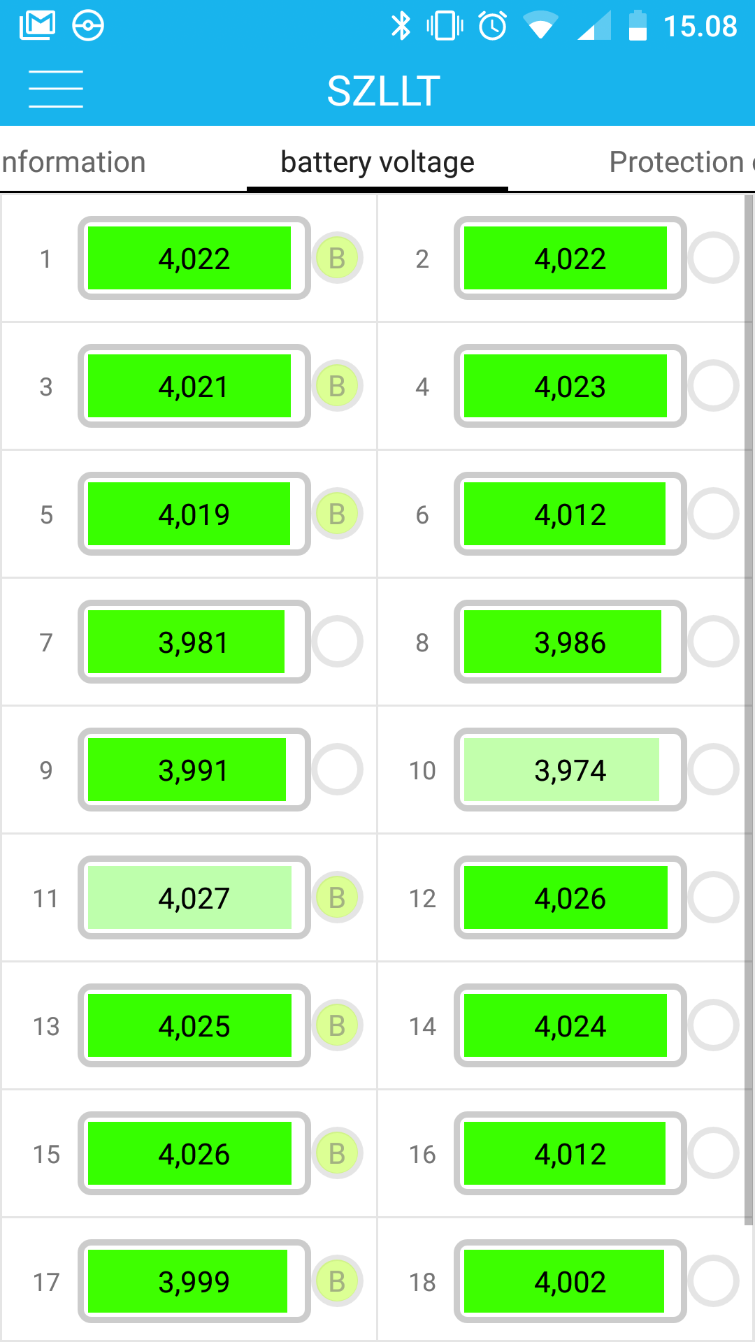 BMS juttelee Android-laitteille sujuvasti bluetoothin välityksellä. Kaikki kennojännitteet saa näkyville, ja lisäksi on neljä lämpöanturia joilla voi kätevästi tutkailla esimerkiksi akuston, moottorin ja ohjainlaitteiden lämpötiloja.