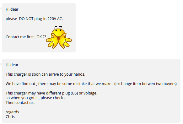 Ja joo, jenkkimallihan se oli, 110V jännitteelle ja ameriikan töpselillä. Oli jonkun kanadalaisen asiakkaan kanssa paketit vaihtuneet. Ilmeisesti Kanadan asiakas oli saanut omansa aikaisemmin ja ihmetellyt vääränlaista töpseliä. Lähetin oman laturini Kanadaan ja vastaavasti sieltä tuli laturi minulle, ja myyjä hyvitti molempien ylimääräiset rahtikulut. Silti oli tiedossa parin viikon ylimääräinen odotus.
