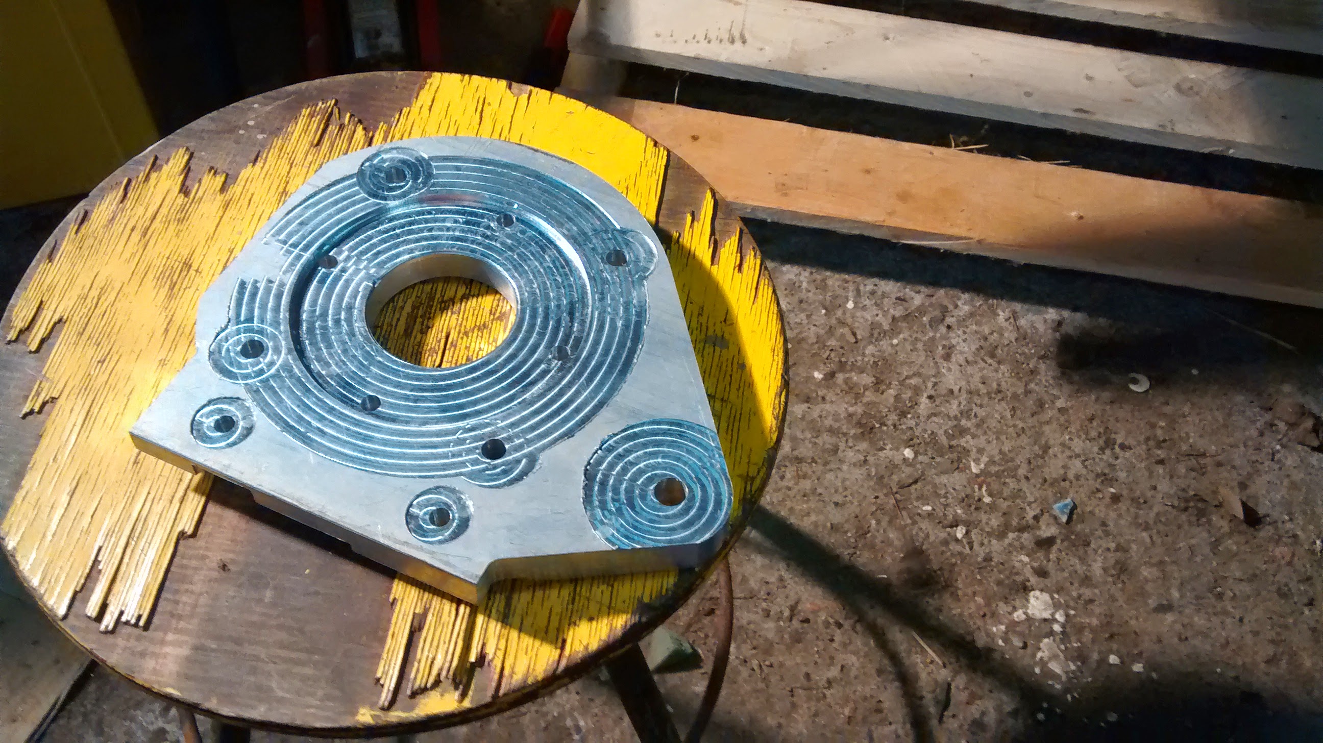 Lopullinen moottoriteline tuli 20mm paksusta alumiinilevystä. Lastulevystä otetuilla mitoilla tein CNC-koneeseen ohjelman, ja hetken päästä oli teline valmis.