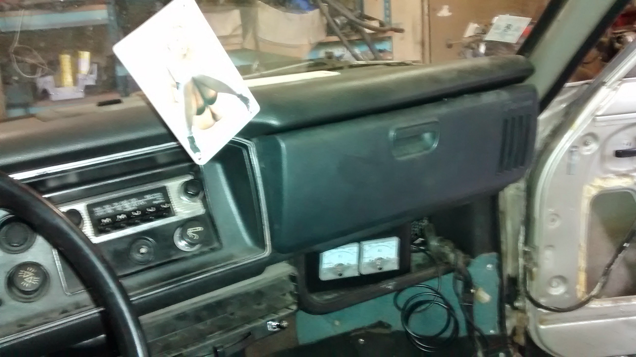 Hansikaslokeron alla on tyhjä lokero, mihin askartelin jännite- ja virtamittarin. Pahoittelut elämää sumeammasta kuvasta. :) Virtamittari ei jostain syystä lähtenyt toimimaan, viisari ei hievahtanutkaan. Syyksi paljastui lopulta vika ohjainlaitteen ohjelmistossa, johon paljon myöhemmin sain valmistajalta päivityksen.