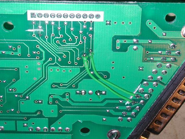 Cut traces starting from pins 1 and 2 from the white connector. Cut two thick traces starting from the D25 connector, and connect those pins with wires as shown above..