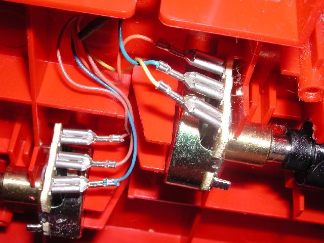 The newly built wire is connected between the center pins of the potentiometers: