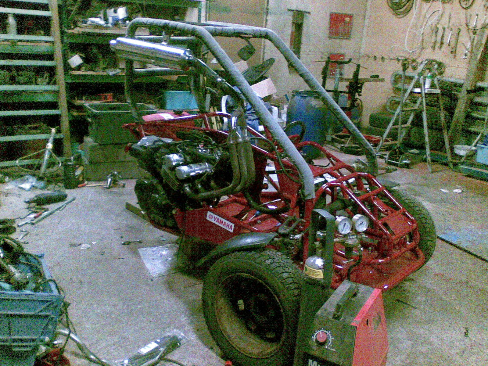 Alkuperäinen moottori oli noin 10-heppainen variaattorivetoinen kapine, joka lepäsi vähän erikoisesti puoliksi taka-akselin päällä. Sen tilalle löytyi nettivaraosasta kolaripyörästä otettu vm 2000 Yamaha Fazer FZS600 moottori, jotain 100hp siinä kai lienee voimaa.