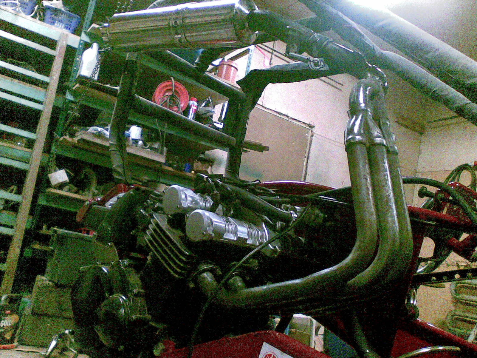 Pyörillään! Pakoputkikin sai lämpönauhan päällensä, jos siihen vaikka joku päättää kaatua naamalleen putkea vasten. :) Pökötin peltivanteet tyylikkäästi nurinpäin asennettuna..