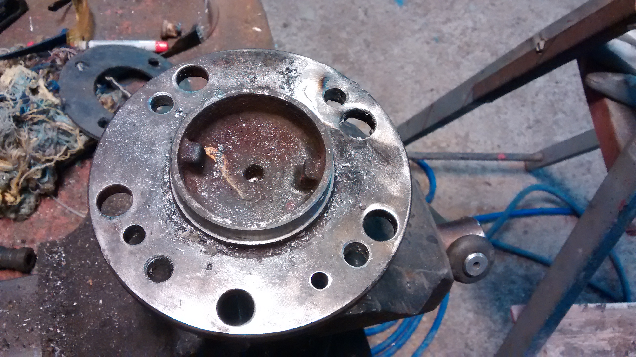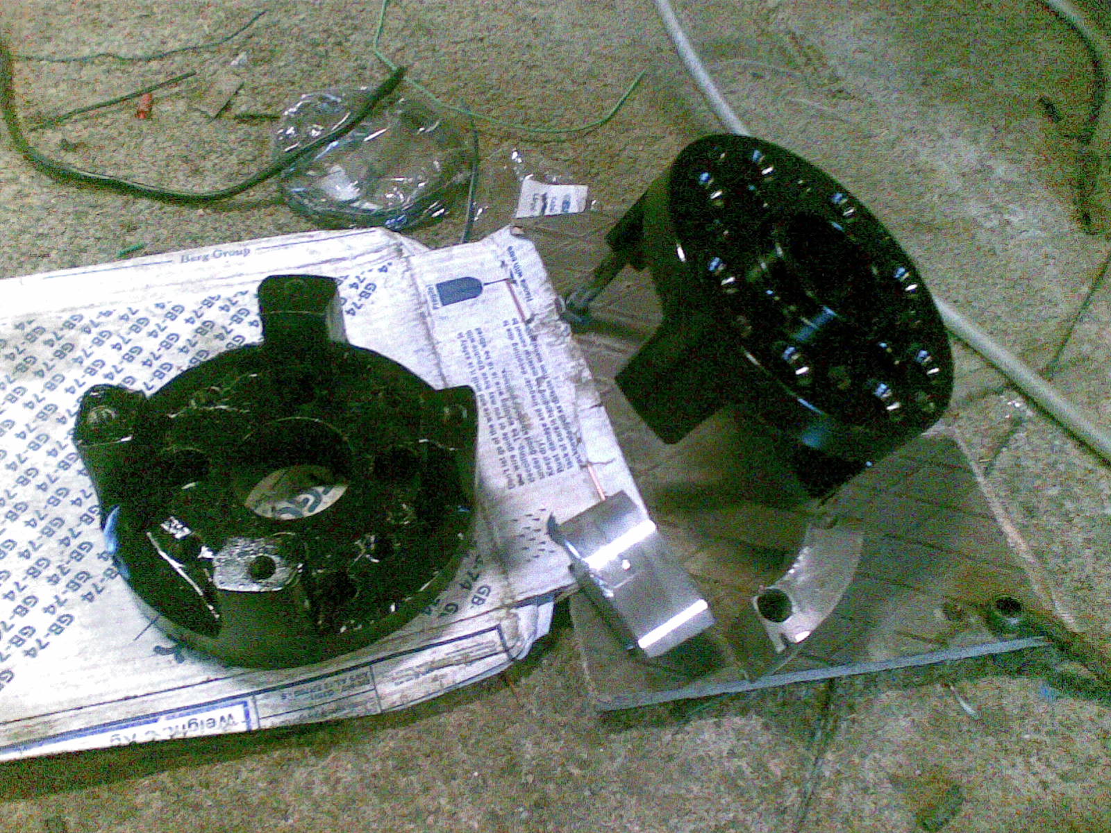 Pyörännavatkin tuli R33 skylinestä. Tarkoitus oli kuitenkin edelleen käyttää Peugeotin vanteita, joten napaan sorvattiin Pösön keskireikä ja porasin 4×108 pulttijaon. Varmaan maailman ainoa näinpäin tehty pulttijakomuutos, että 5-pulttisesta 4-pulttiseen..