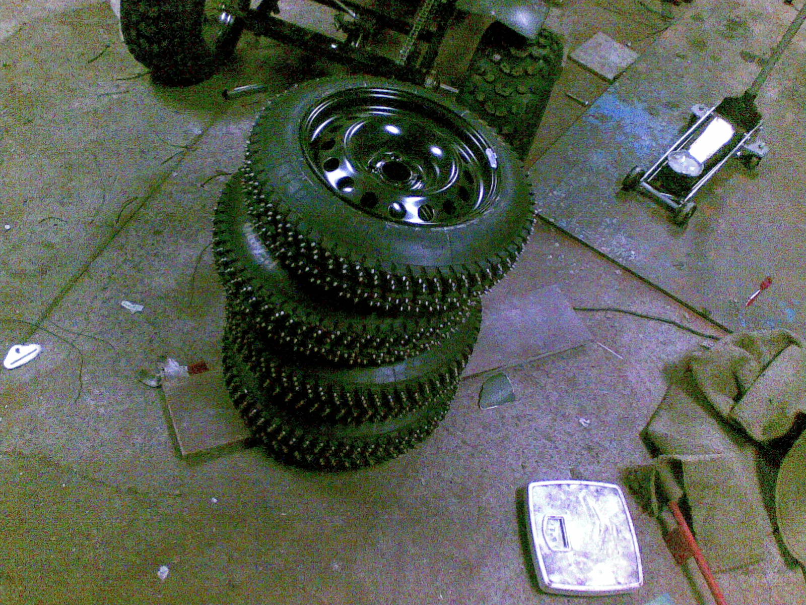 Heti ekalla lyhyellä koeajolla tuli huomattua että Peugeotin Hakkapeliitta -nastarenkailla ei kyllä tee tässä laitteessa mitään, noilla alkuperäisillä mönkkärirenkaillakin etenee paremmin. Hommasin edukkaasti yhden kisan ajetut jääratapyörät, Pösön vanteilla. Koko on vähän reilu 16“ mutta tuleepahan maavaraakin tarpeeksi samalla..