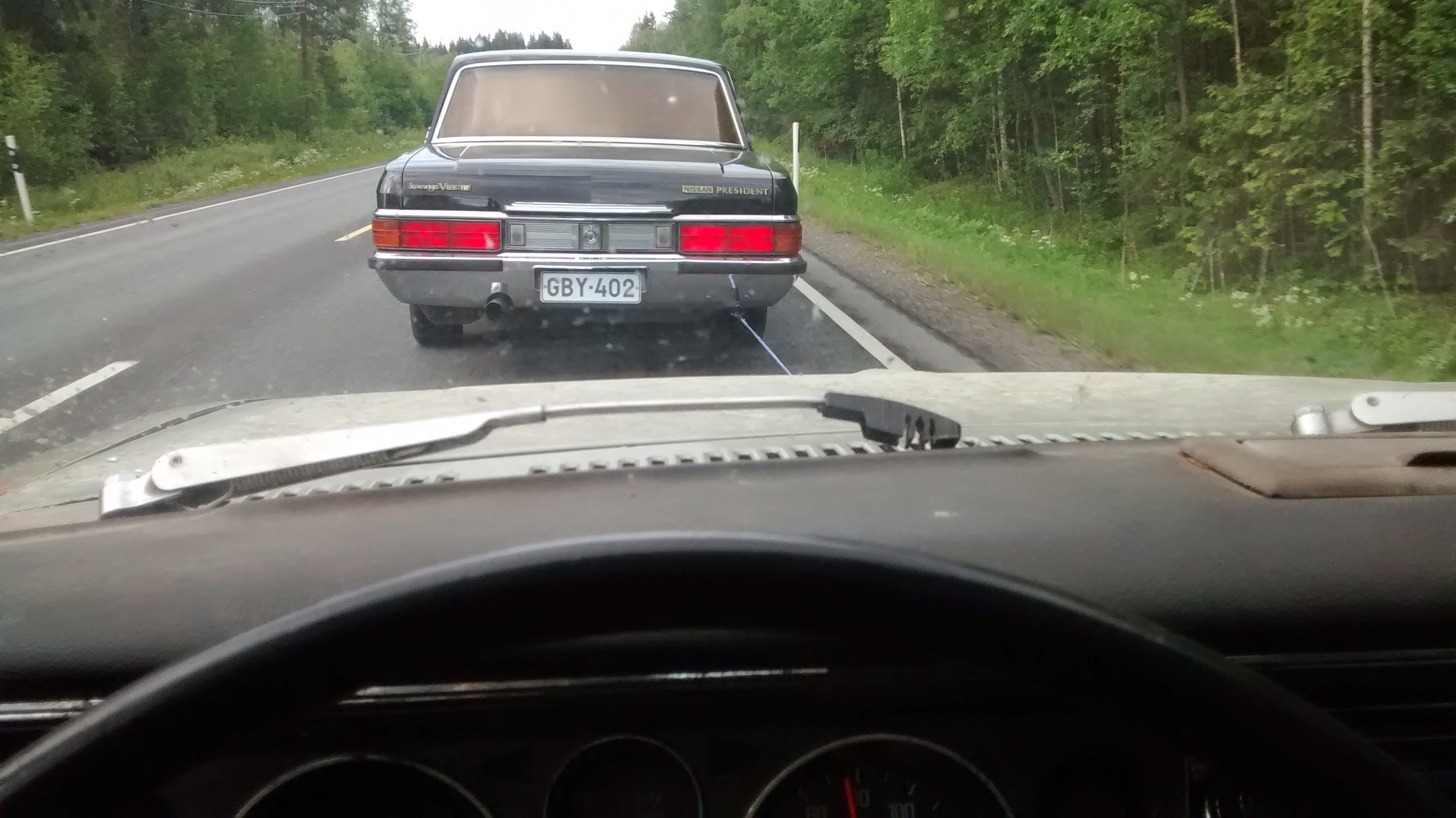 50km ennen kotipihaa tulikin keskeytys, vesipumpun hihna katkesi. Tuulosesta saatiin maailman pisintä mallia oleva hinausköysi, ja matka jatkui kyseisen Presidentin takakonttia ihaillen. Samalla vaan vahvistui ajatus sähköautoilun loistokkaasta tulevaisuudesta, ei ole sähköautossa ihan niin montaa liikkuvaa osaa keskeytyksiä aiheuttamassa..