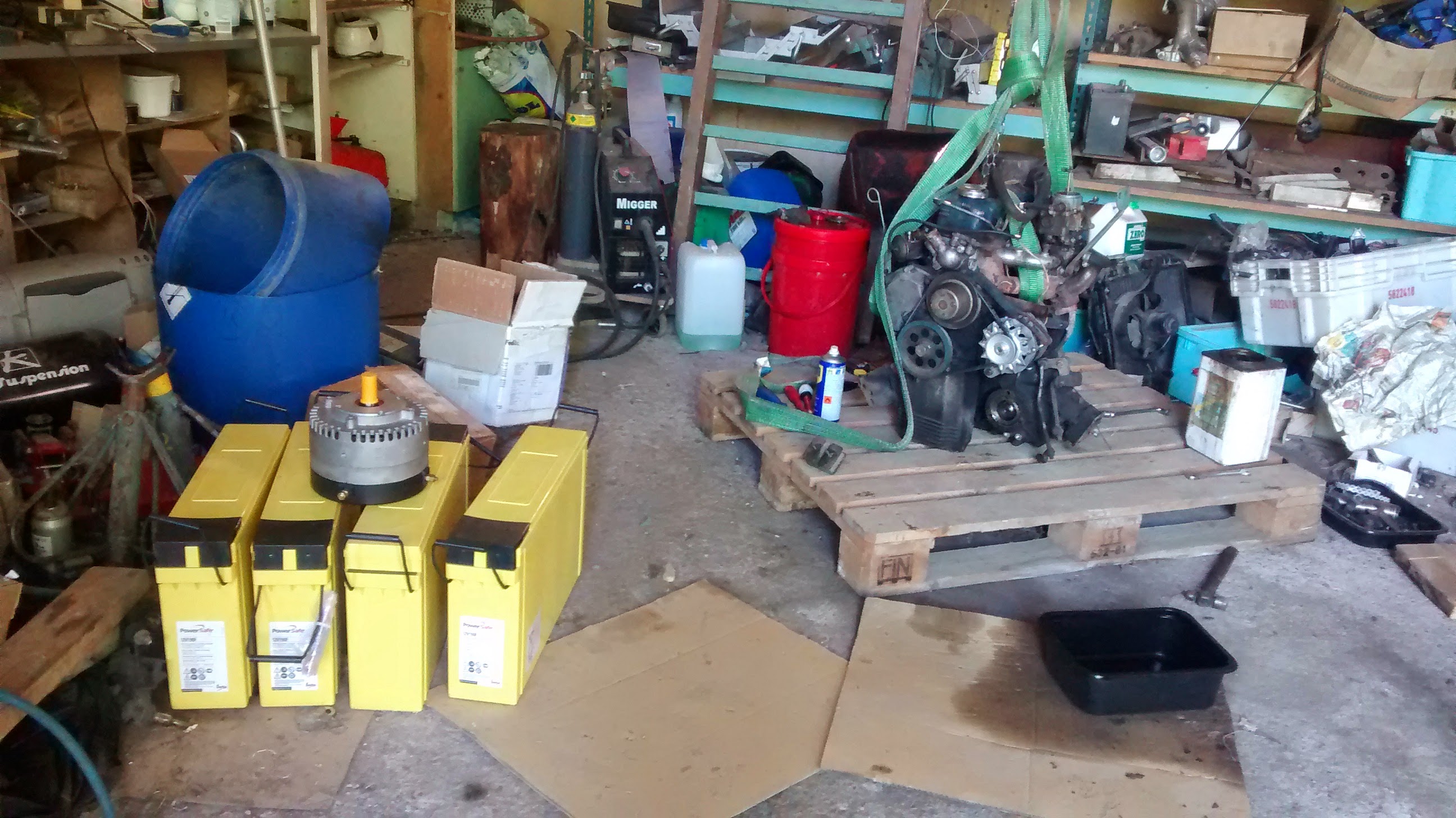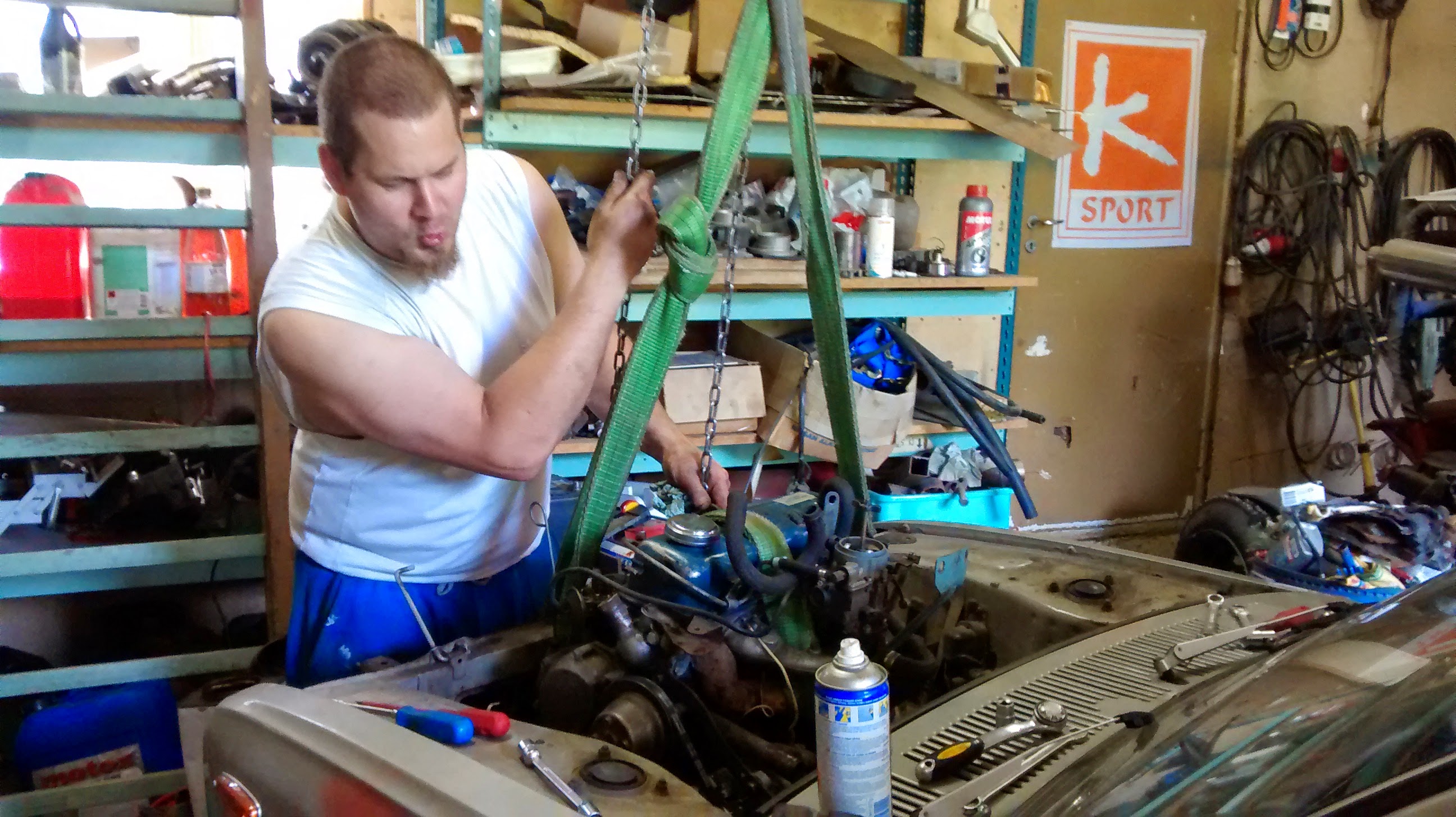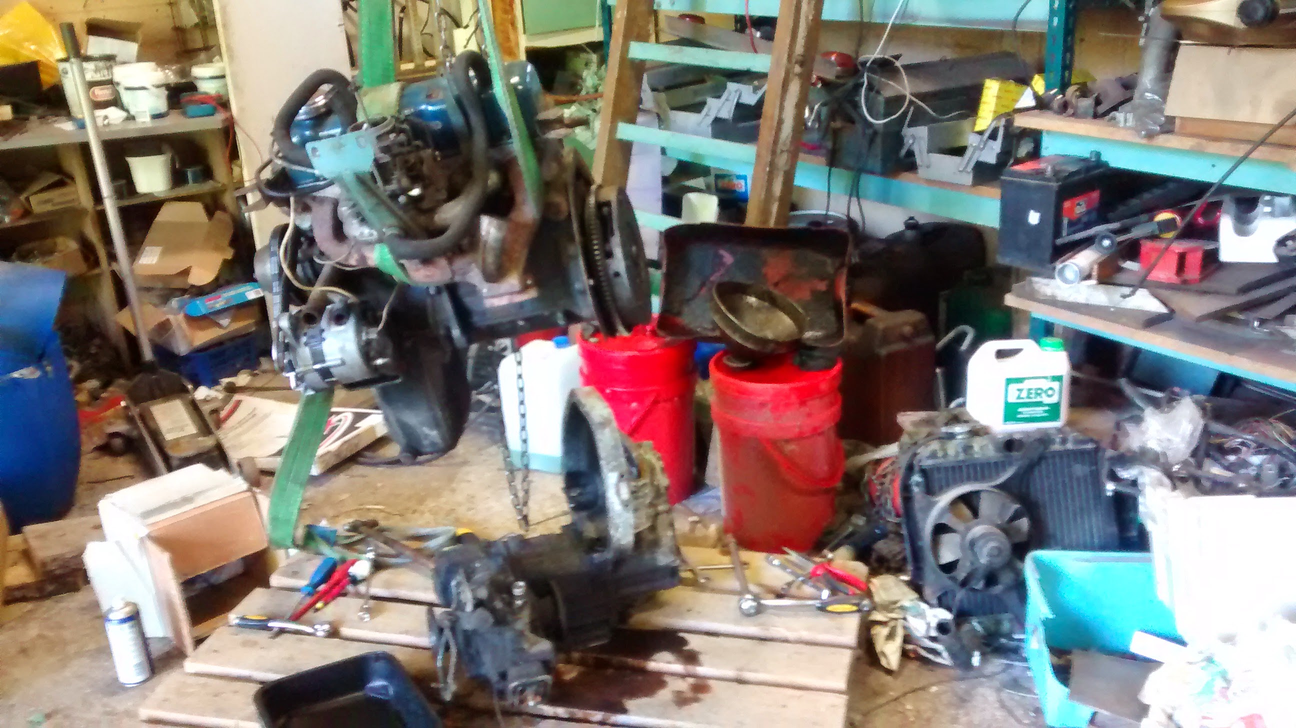 Lähes heti kun auto oli pihassa, saapui paikalle yhden miehen tehotiimi Tero tenttaamaan että milloin nostetaan kone pois. No sehän piti sitten nostaa samantien. No saattoi siinä viikko olla välissä. :) Alla vähän kuvakollaasia työvaiheista, klikkaamalla saa suuremmaksikin. :) Kuvassa näkyy myös moottorin irrotus vaihdelaatikosta, ja vieressä odottava sähkömoottori ja 4kpl 190Ah AGM-akkuja..