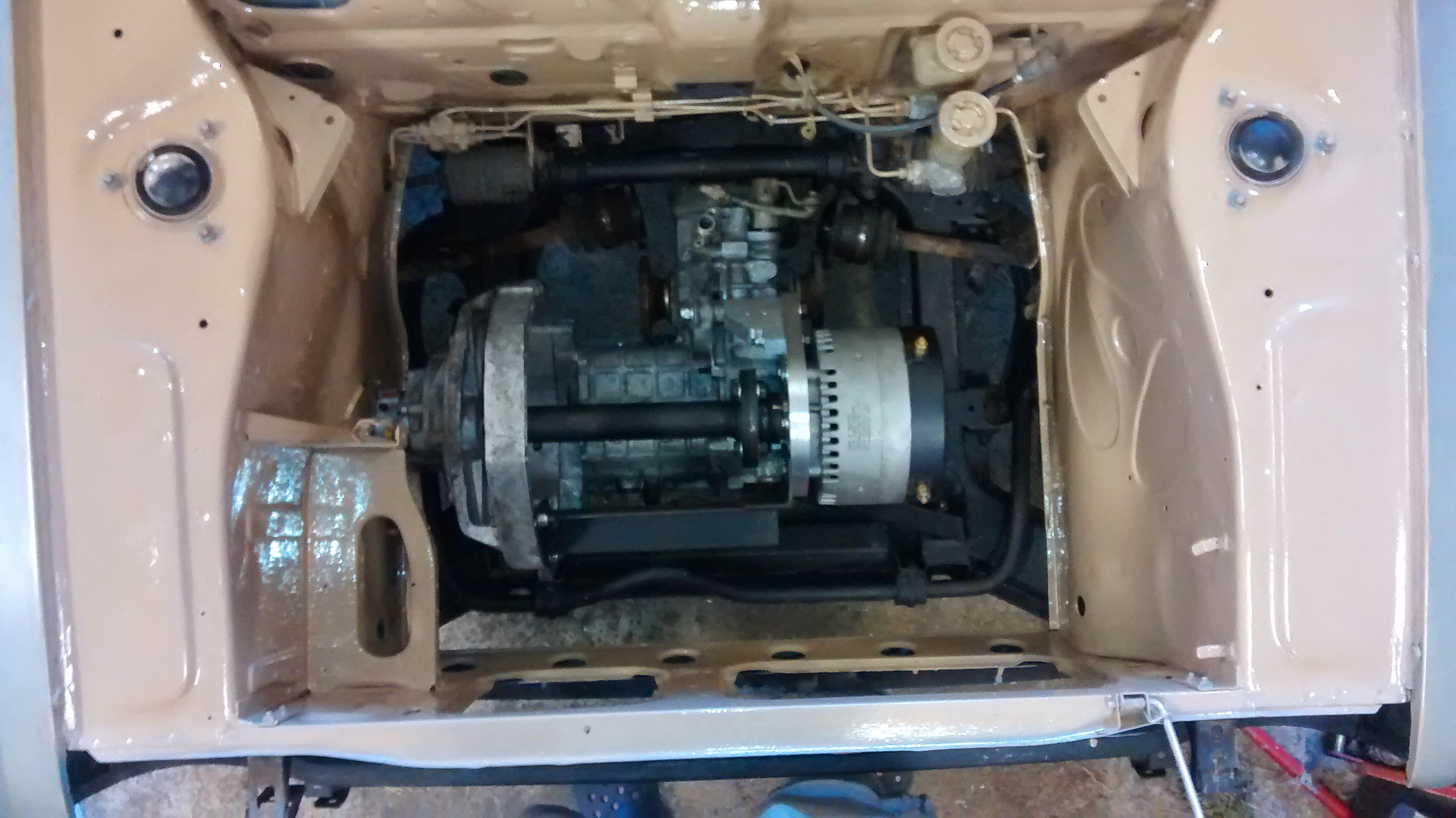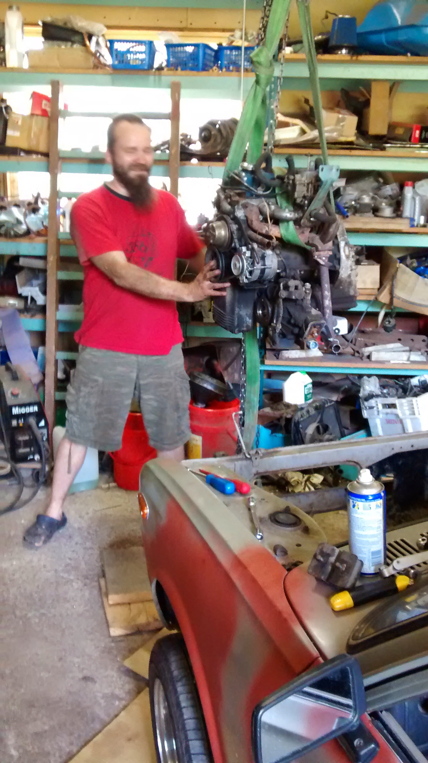 Kaveri sorvaili akselin että saatiin moottori yhdistettyä voimansiirtoon. Alkuperäisestä kytkinlevystä rälläköitiin spoorit irti, ja se hitsaten akselin toiseen päähän. Moottorin päässä on kiilaura ja pultti, noiden asennus vaatii että akselissa täytyy olla laippaliitoskin josta sen saa katkaistua.