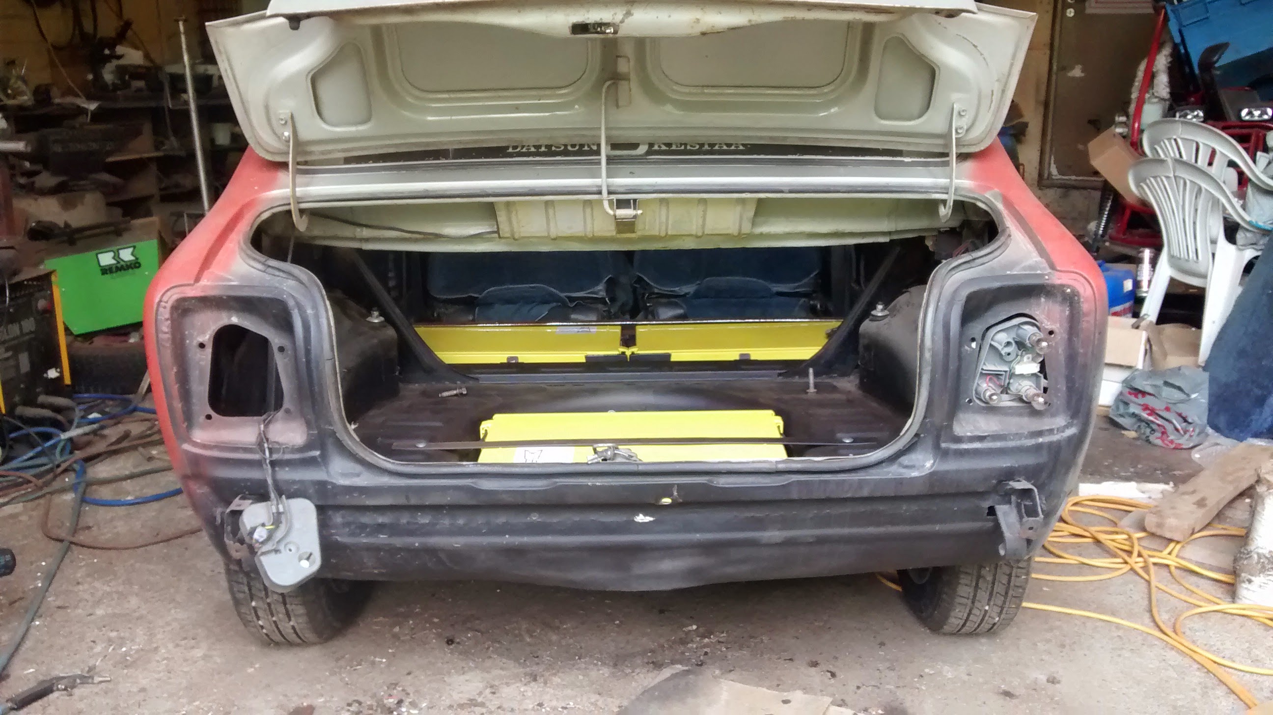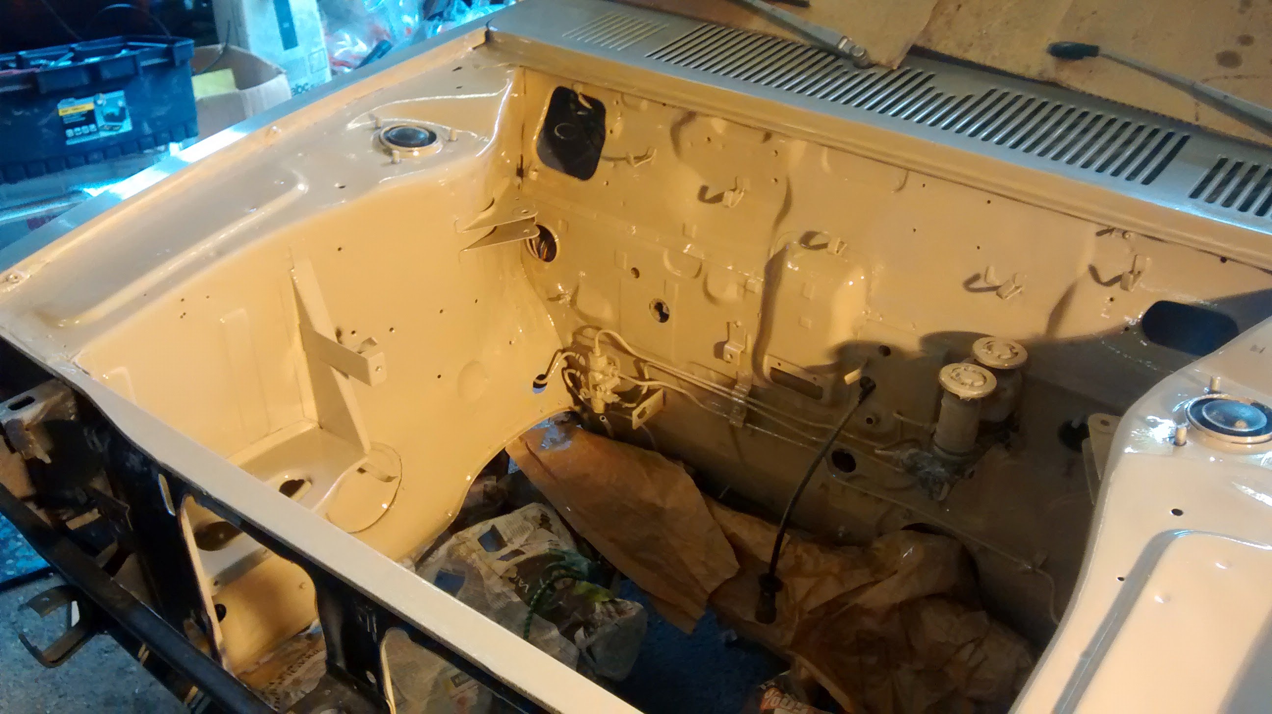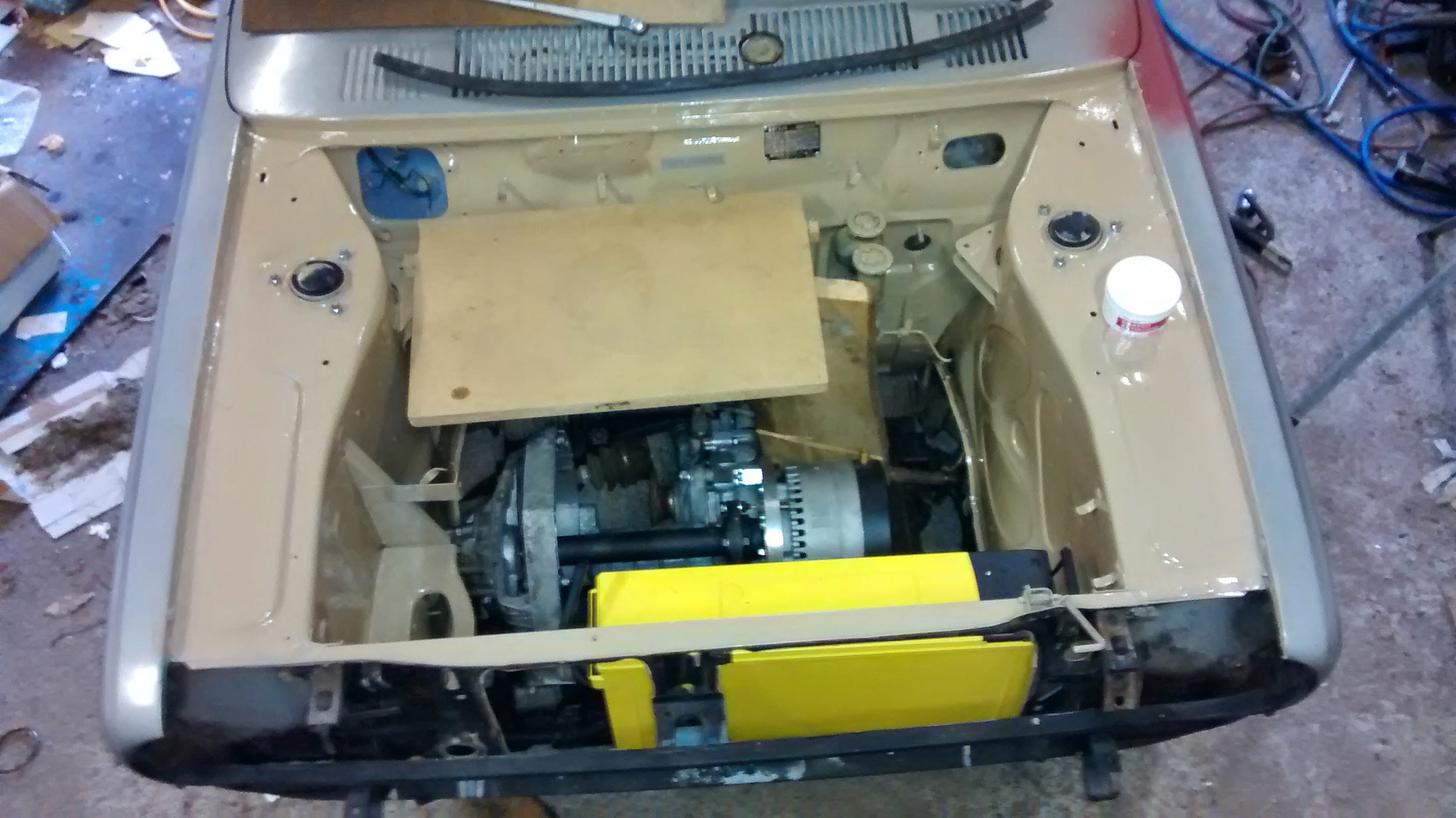 Nettiauton halvin 100A maksoi 600 euroa ja löytyi Uudestakaupungista. Sitähän piti lähteä lähes samantien hakemaan. Auto vaikutti periaatteessa ihan lupaavalta, siinä oli korin maalausprojektia aloiteltu ja kaikki puretut osat oli pakattu autoon mukaan. Varsin epäsiistiissä vaiheessa toki tuommoinen puoliksi kittailtu kori.