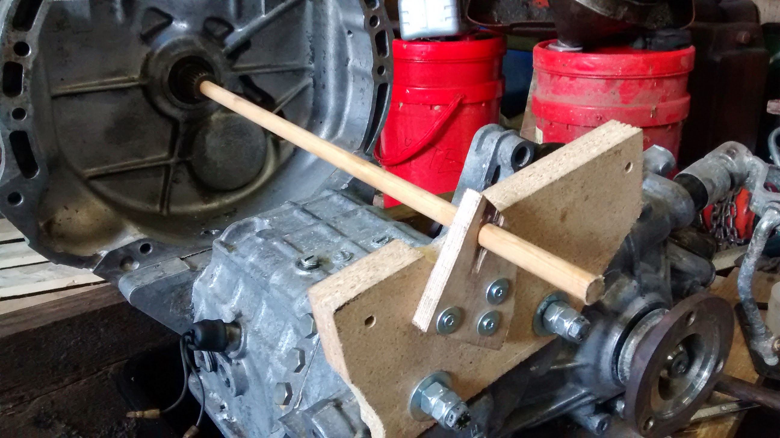 Moottori ei ihan mahtunut tuohon vaihdelaatikon päälle, vaan se täytyi viedä vaihdelaatikon toiselle puolelle ja väliin noin 30cm pitkä akseli. Akselilinjaa mallailin ihan puukepin kanssa, ja sitten rakentelin väliaikaisen moottoritelineen lastulevystä oikeaan kohtaan.