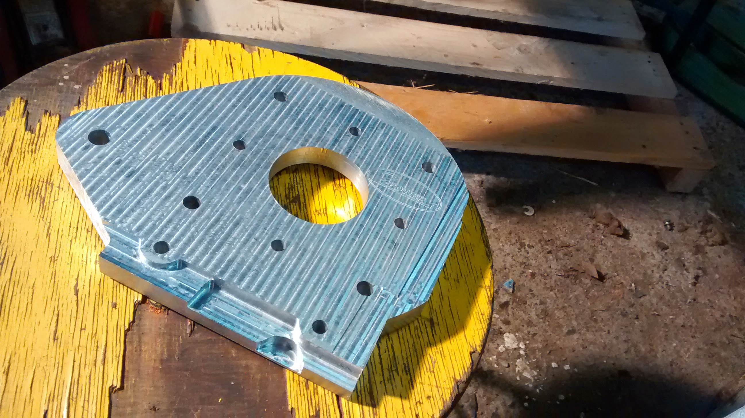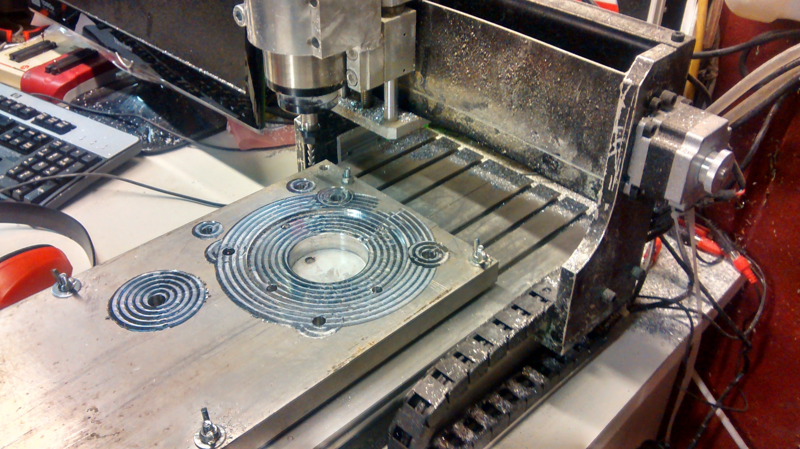Lopullinen moottoriteline tuli 20mm paksusta alumiinilevystä. Lastulevystä otetuilla mitoilla tein CNC-koneeseen ohjelman, ja hetken päästä oli teline valmis.