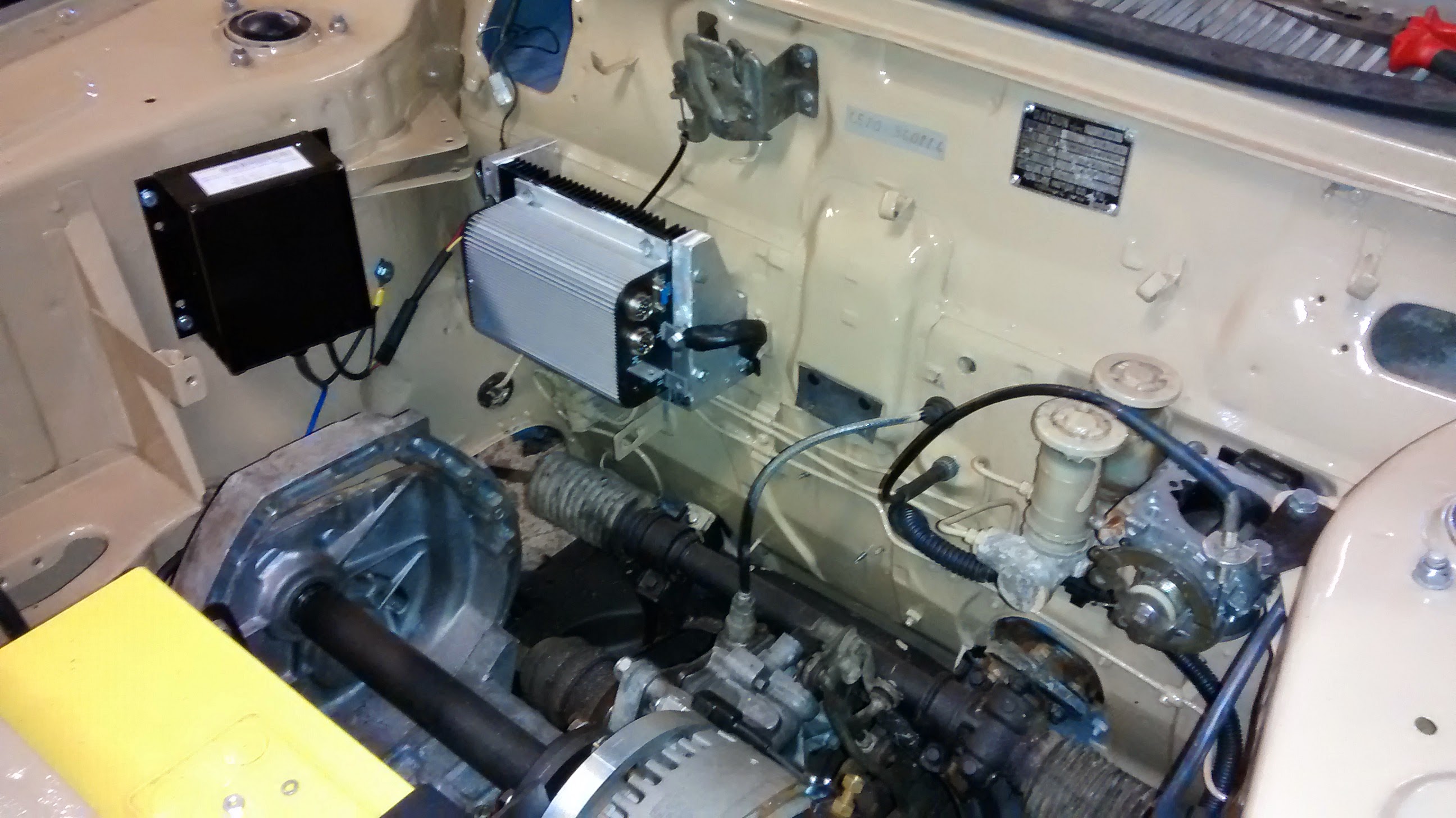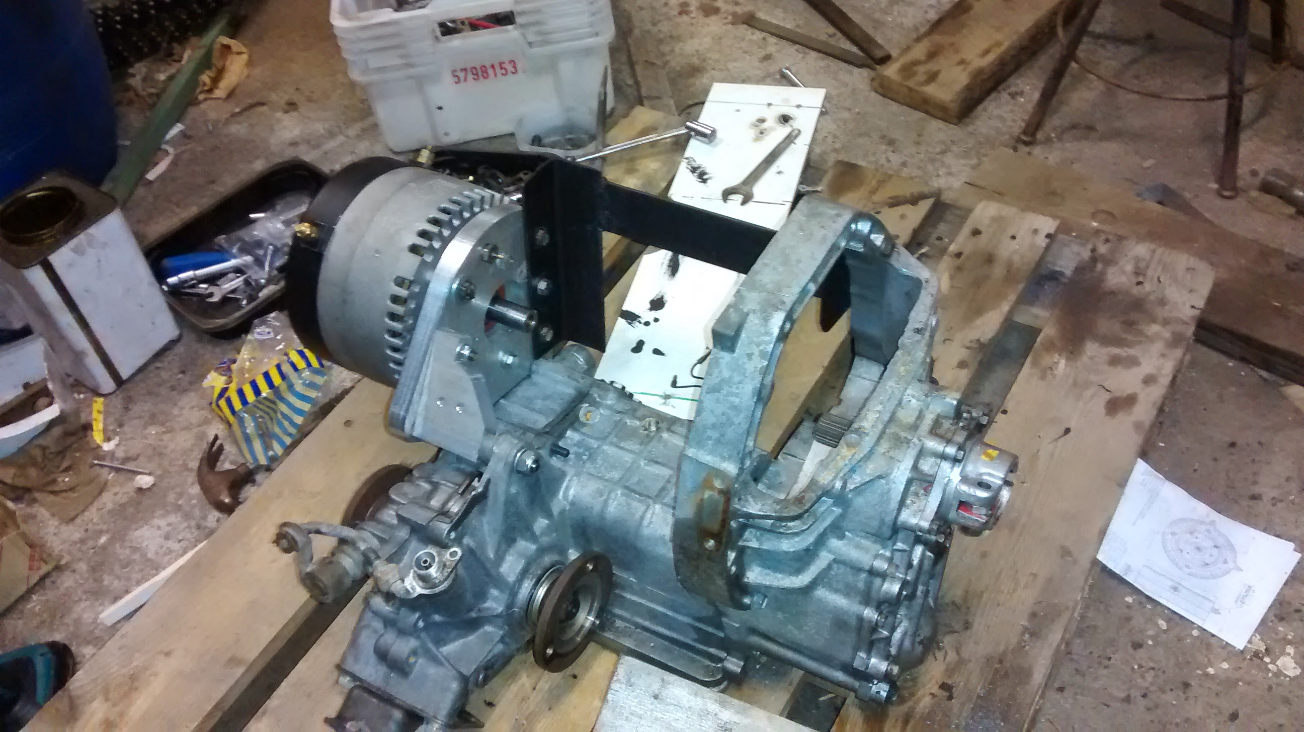 Sitten alkoi itse tekniikan sovittelu. Alkuperäinen vaihdelaatikko jää paikoilleen, sähkömoottori liitetään suoraan kytkinakselin päähän. Arvelin että kytkintä ei tarvita, sillä sähkömoottori pyörii kyllä aivan vapaasti ympäri kun virtaa ei ole kytketty.