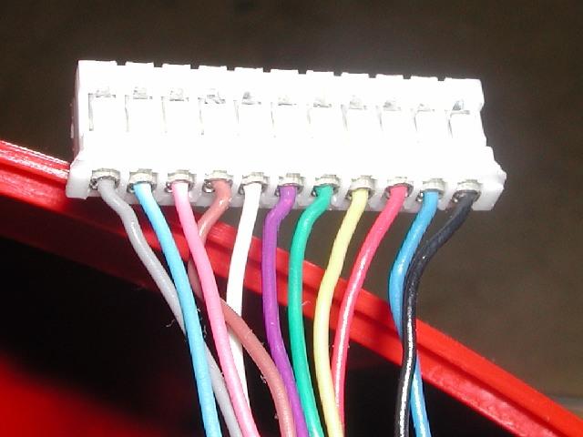 The image is not very good, so here's the wires listed from left to right, when connector clips are facing up.. Gray, light blue, pink, brown, white, purple, green, yellow, red, dark blue, black. The pinout page has all these pins explained as well.