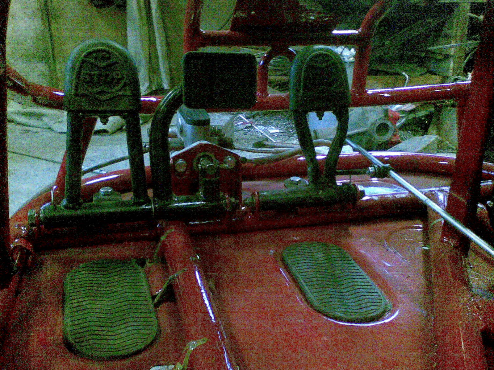 Fudessa oli alkujaan vain kaksi poljinta, kaasu ja jarru. Tein vanhasta jarrupolkimesta kytkimen, ja siirsin polkimia niin paljon sivulle että uusi jarrupoljin mahtui väliin.