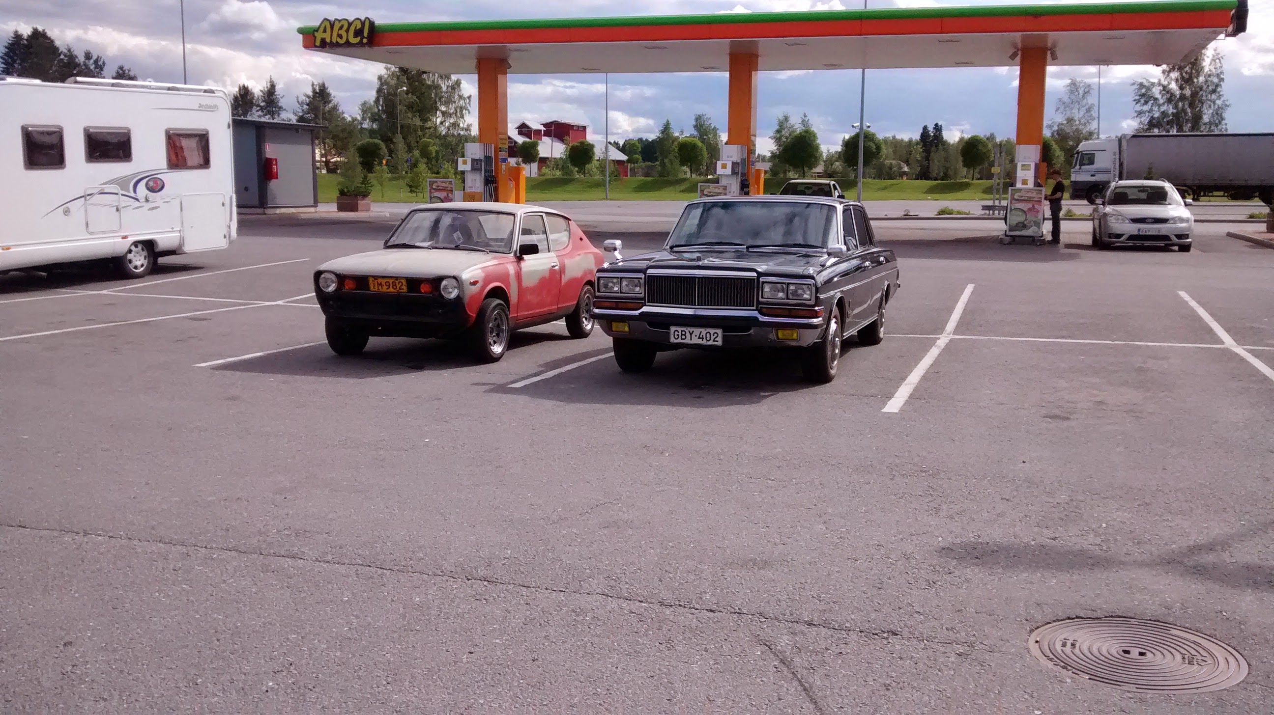 Parkissa huoltoaseman pihassa, Nissan Presidentin kaverina: